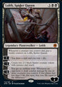 Whenever a creature you control dies, put a loyalty counter on Lolth, Spider Queen. [0]: You draw a card and you lose 1 life. [−3]: Create two 2/1 black Spider creature tokens with menace and reach. [−8]: You get an emblem with "Whenever an opponent is dealt combat damage by one or more creatures you control, if that player lost less than 8 life this turn, they lose life equal to the difference."