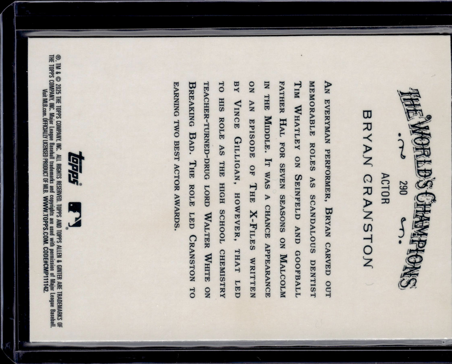 This is a nice example of a 2025 Topps Allen & Ginter #290 Bryan Cranston Chrome Purple Refractor Other important information about this card:SNIn 2025 Bryan Cranston played for the Actor.Please check out our other listings for more great cards.