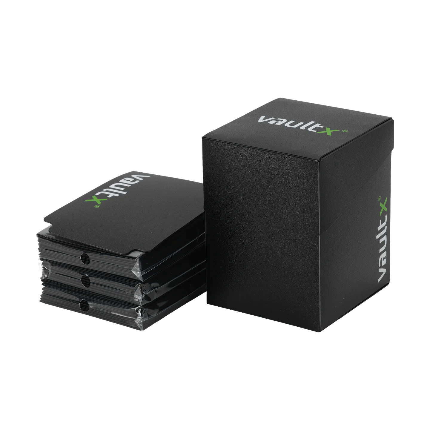 Small card deck box with 100 standard size black deck protector sleeves to fit a variety of standard sized cards. Made from archival-safe, acid-free non-PVC material the Vault X is the perfect way to store your cards. 12 Month Warranty from date of purchase.