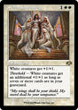 White creatures get +1/+1. Threshold — White creatures get an additional +1/+1 as long as seven or more cards are in your graveyard.