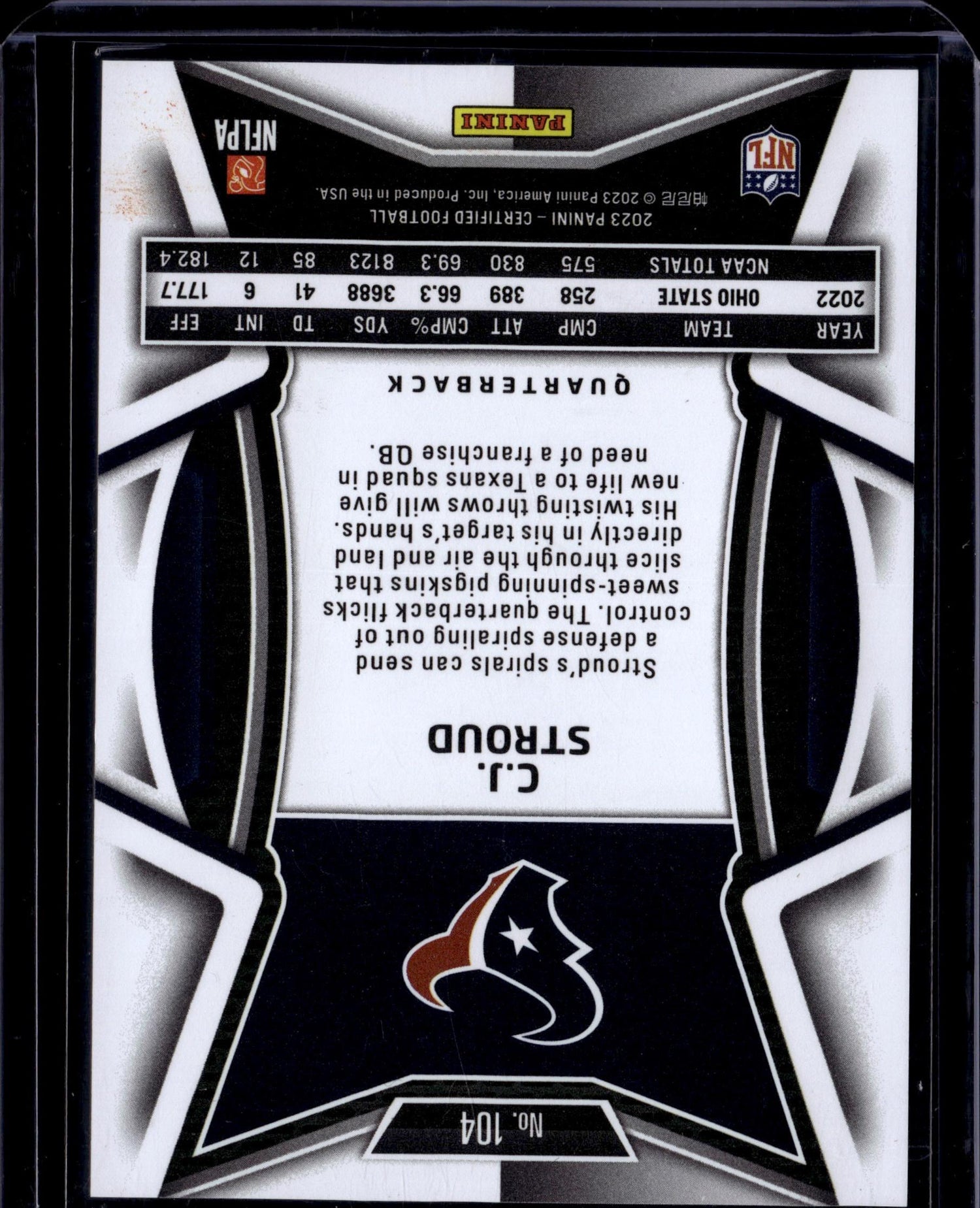 This is a nice example of a 2023 Panini Certified #104 C.J. Stroud Mirror Orange Other important information about this card:SN,RCIn 2023 C.J. Stroud played for the Houston Texans.Please check out our other listings for more great cards.