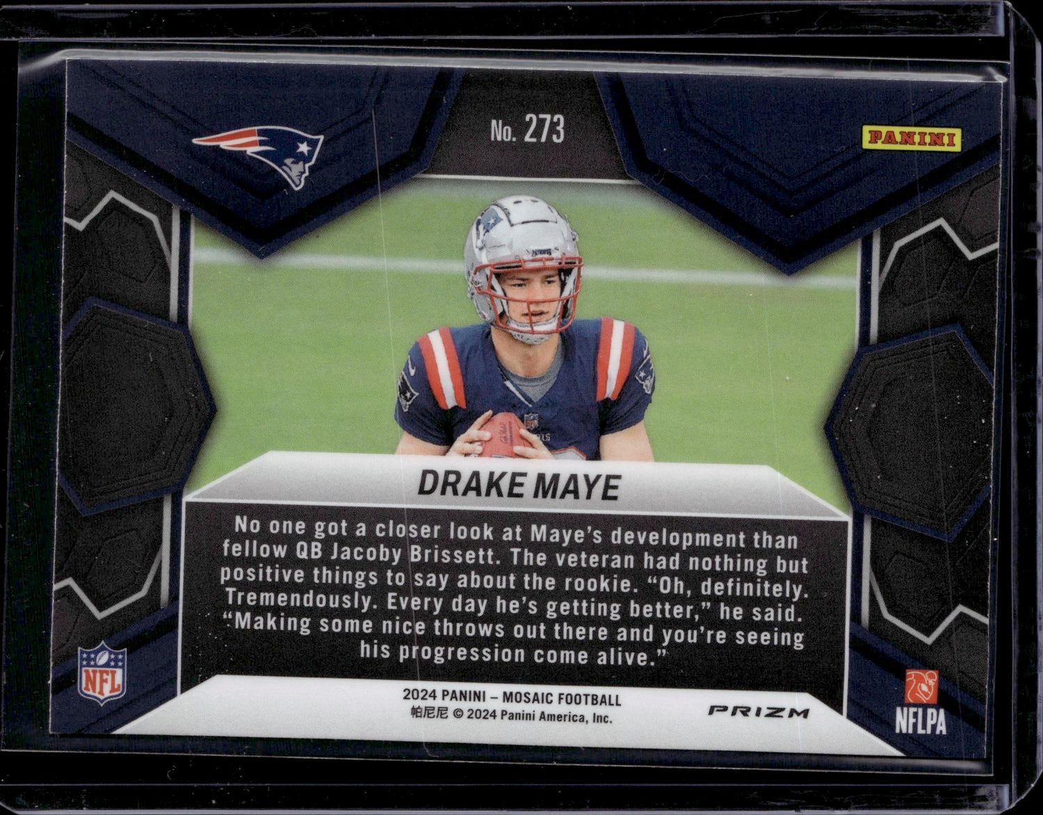 This is a nice example of a 2024 Panini Mosaic #273 Drake Maye Mosaic Reactive Blue Other important information about this card:In 2024 Drake Maye played for the New England Patriots.Please check out our other listings for more great cards.