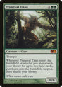 Trample Whenever Primeval Titan enters the battlefield or attacks, you may search your library for up to two land cards, put them onto the battlefield tapped, then shuffle.