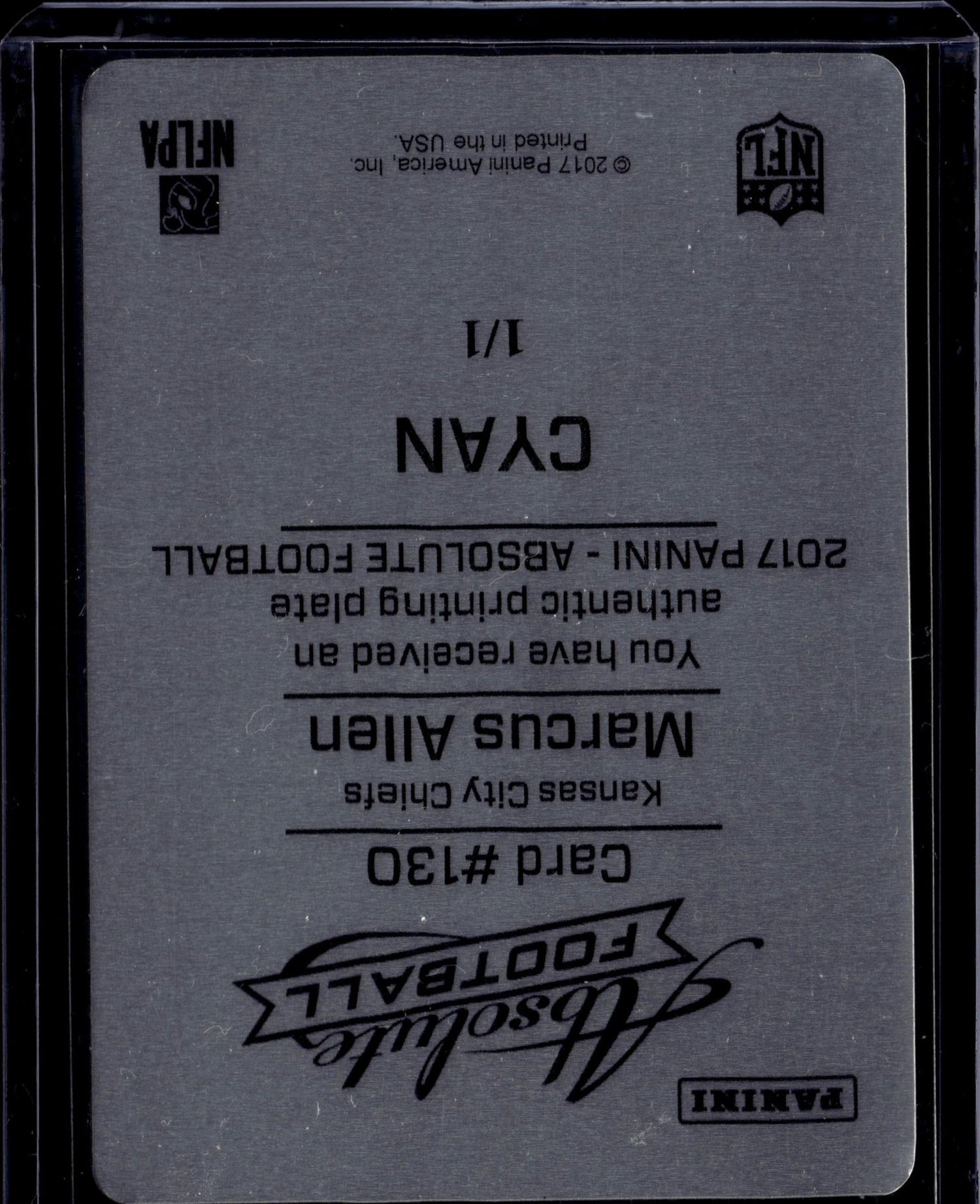 This is a nice example of a 2017 Panini Absolute #130 Marcus Allen Printing Plates Cyan Other important information about this card:SNIn 2017 Marcus Allen played for the Kansas City Chiefs.Please check out our other listings for more great cards.
