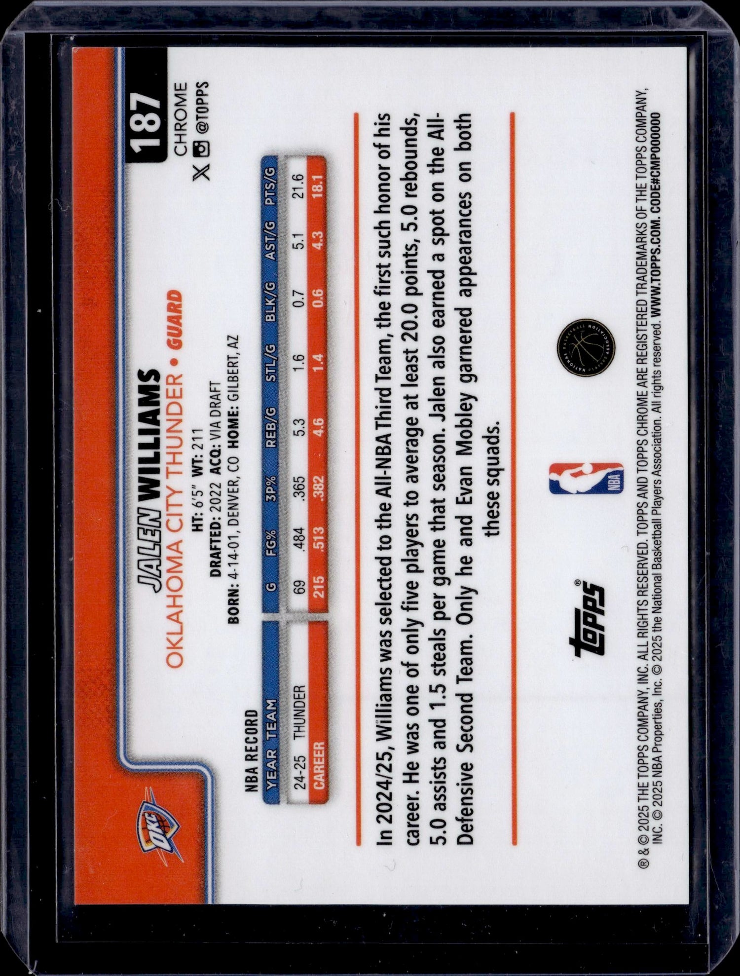 2025-26 Topps Chrome #187 Jalen Williams Orange Basketball Refractor #/25