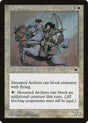 Reach (This creature can block creatures with flying.) {W}: Mounted Archers can block an additional creature this turn.