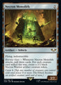 Flying, indestructible Eternity Gate — Whenever Necron Monolith attacks, mill three cards. For each creature card milled this way, create a 2/2 black Necron Warrior artifact creature token. Crew 4 (Tap any number of creatures you control with total power 4 or more: This Vehicle becomes an artifact creature until end of turn.)